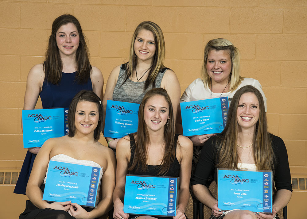 back l-r Melissa Mommoliti (volleyball), Erica Jackson (badminton), Emily Davis (woodsmen), Kaylee Little (rugby), Theresa Rankin (basketball), Ellen Sharp (soccer)