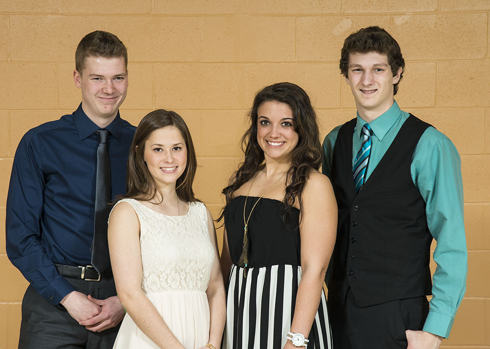 front l-r Jason Withrow (woodsmen), Harris Bakker (badminton), Tyler MacDonald (basketball), Josh Borgal (soccer)