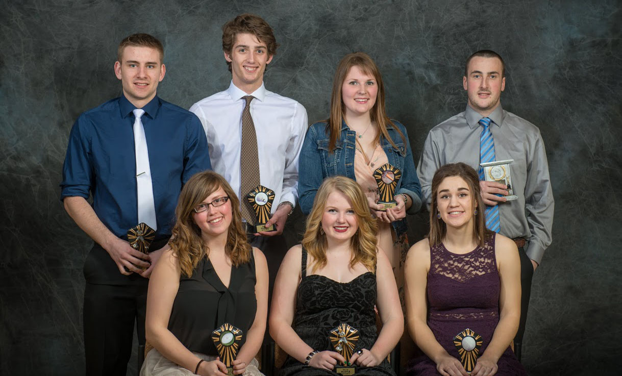 back left-right Hannah Arseneault (cross country), Brette Holland (golf), Connor Morse (woodsmen), Richard MacNevin (soccer), Andrew Sytsma (badminton), Melanie Bos (woodsmen), Becca MacSwain (equestrian)