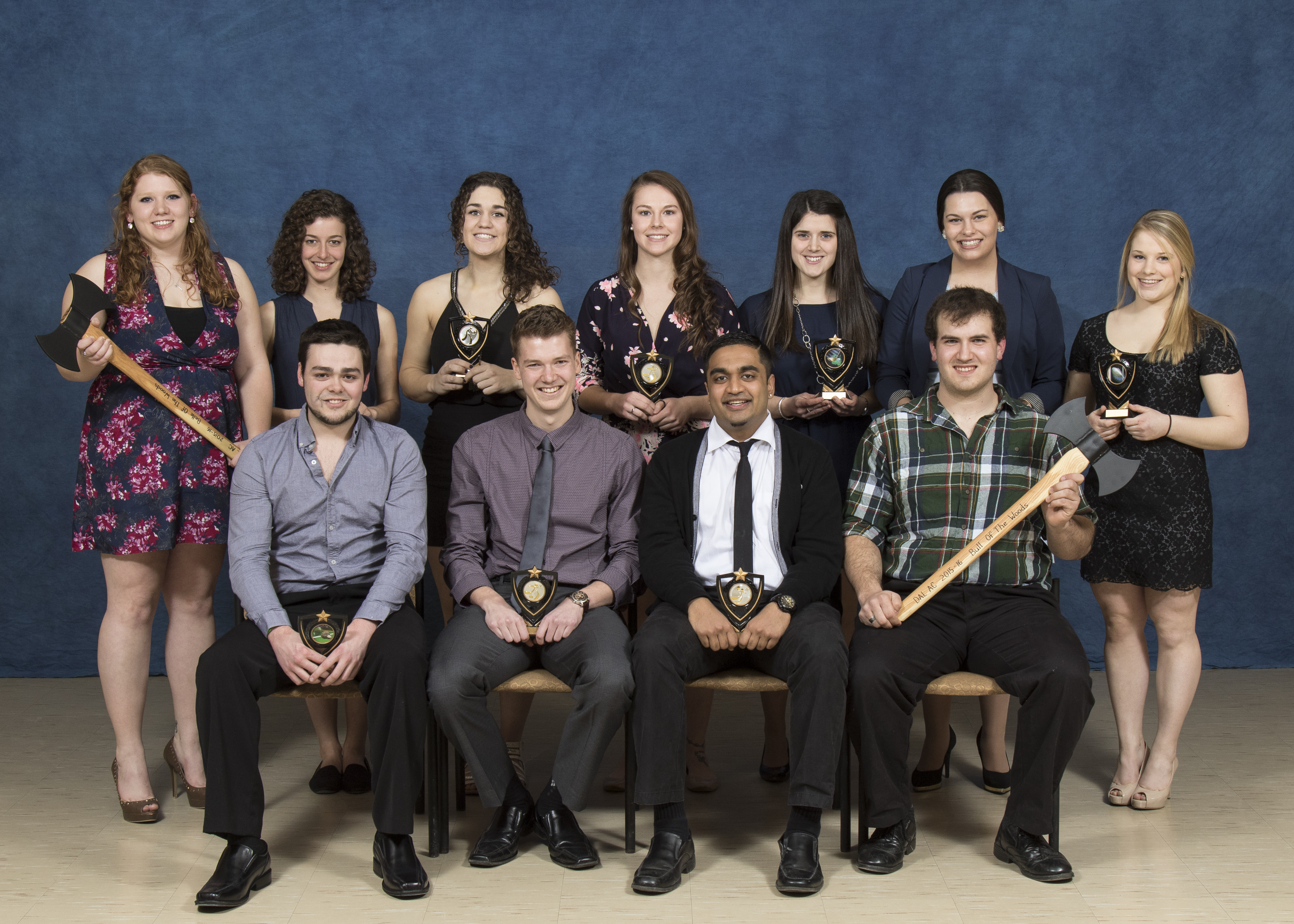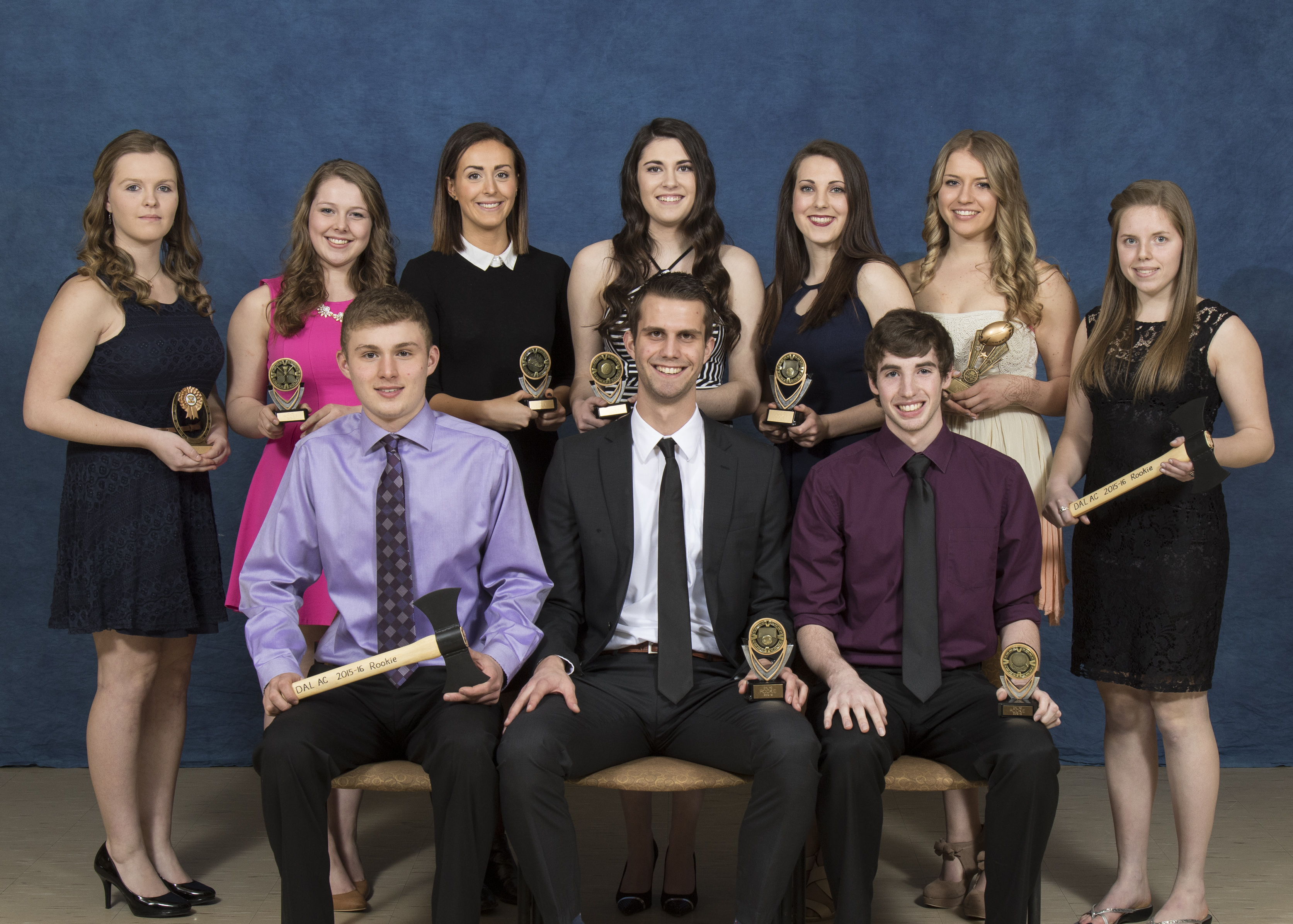 back left-right Jessie Swinamer (woodsmen), Hannah Arseneault (cross country), Thea McLachlin (volleyball), Emily Merks (soccer), Brette Holland (golf), Rebecca MacSwain (equestrian), Katie McQueen (rugby)
